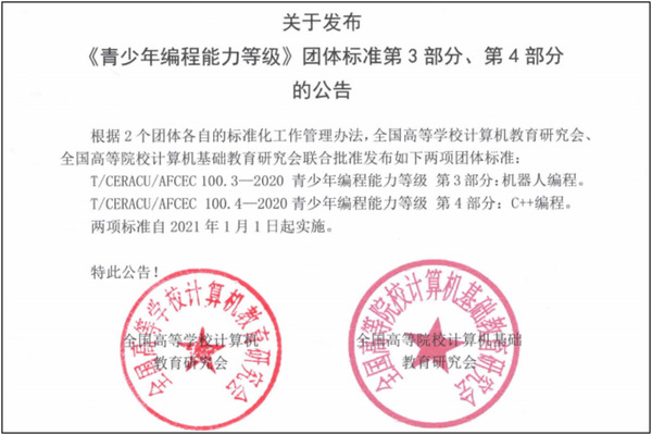 本网讯(通讯员 陈宇)近日,pp电子计算机学院杨莉教授、陈宇副教授参与制定的《青少年编程能力等级》团体标准第三部分(机器人编程)、第四部分(C/C++语言编程)经全国高等学校计算机教育研究会、全国高等院校计算机基础教育研究会联合批准发布并在全国团体标准信息平台成功备案。