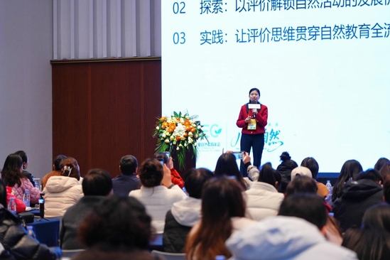 会上,伍香平作了题为《在自然中感知 在体验中成长——评价视角下的自然教育实践》的主题分享,深入剖析了当前幼儿园自然教育实践的核心问题。她结合个人专著《儿童体验论》的观点指出,当前学前教育实践中存在儿童发展证据缺失的问题,强调幼儿教师应通过评价解锁自然活动的发展价值,将评价思维贯穿自然教育全过程。