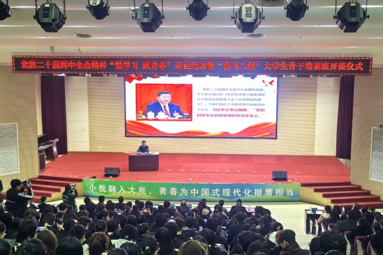 本网讯(通讯员 时万祥)12月18日下午,学校在图书馆二号报告厅举行“悦学习·跃青春”党的二十届四中全会精神示范宣讲暨“青马工程”大学生骨干培训班开班仪式。校党委书记张文学以《凝聚青春力量,投身伟大征程,从学习贯彻党的二十届四中全会谈新时代青年的使命担当》为题作示范宣讲。党委常委、宣传部部长周忠出席,党委常委胡庆山主持仪式。