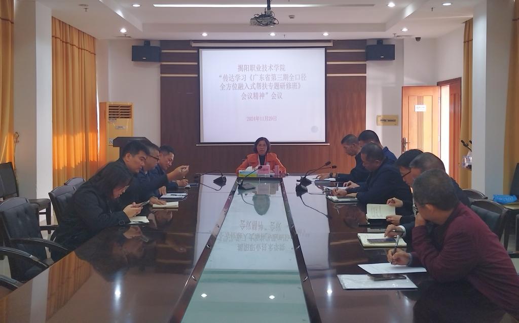 11月29日上午,学校在行政楼507会议室召开“传达学习《广东省第三期全口径全方位融入式帮扶专题研修班》会议精神”会议。党委委员、副院长刘瑞叶,党政办公室、组织人事处、宣传统战部、教务处、学生工作处、财务处、科技与设备处、师范教育系、信息工程系和继续教育部负责人出席了本次会议。会议由党委委员、副院长刘瑞叶主持。